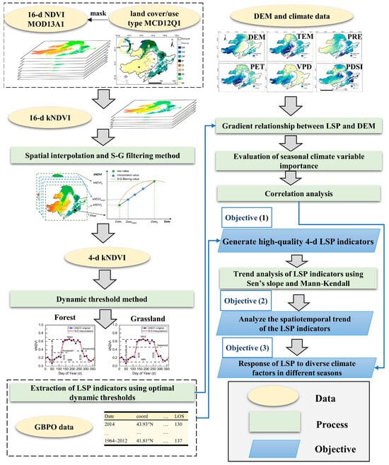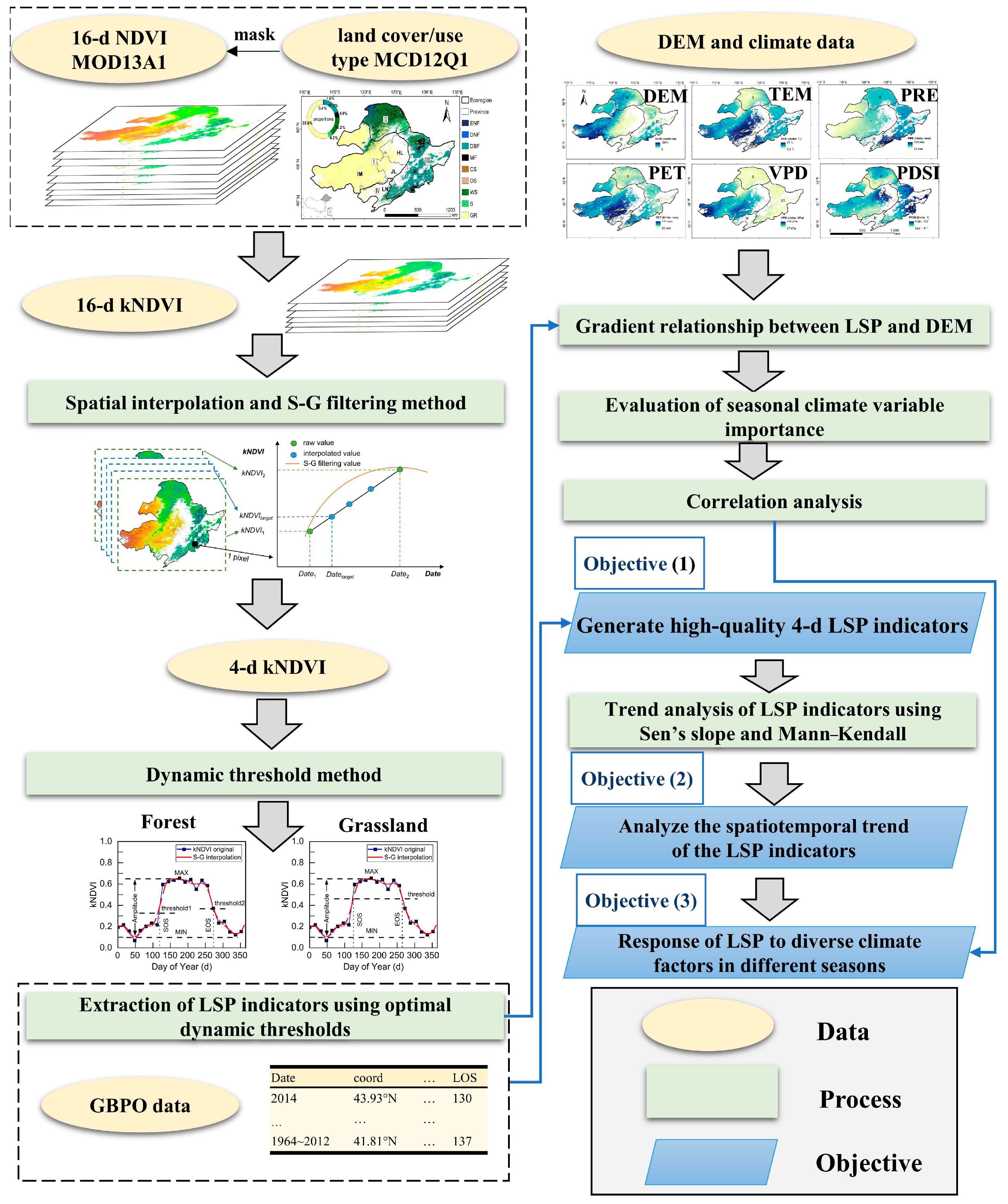 Figure 3 shows the flowchart of this study. This study consists of three aims: (1) to generate high-quality 4-d LSP indicators and investigate the spatial patterns; (2) to analyze the phenology trends in different vegetation cover types; (3) to explore the response of LSP to climate factors in different seasons.