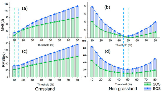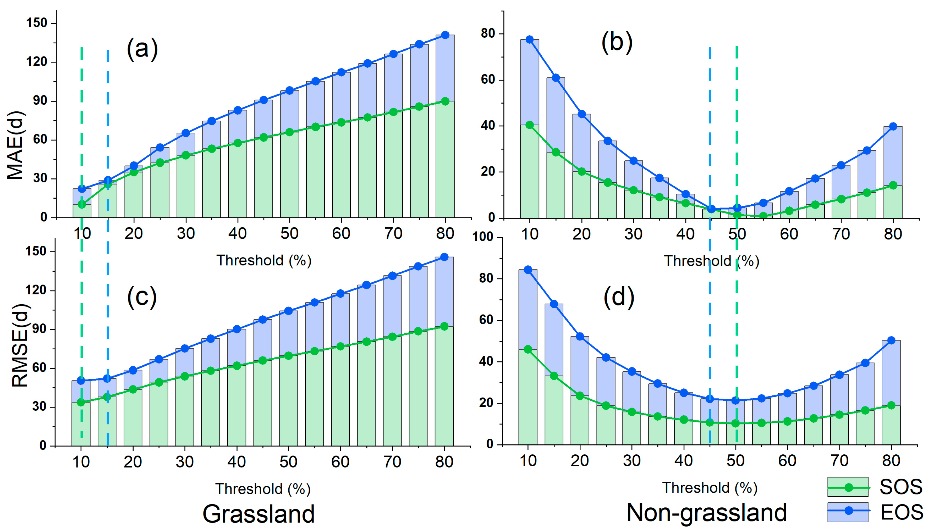 The selections of optimal dynamic thresholds of SOS and EOS for grasslands (a,c) and non-grassland regions (b,d) based on MAE and RMSE. Note: the stacked bar chart shows the total error (height of the bar) and the independent errors for SOS (green) and EOS (blue), with the total height representing the combined error. The thresholds were selected based on the lowest error values indicated by the different curves in the plot. The minimum error thresholds for SOS and EOS are marked by green and blue dashed lines, respectively, to indicate their optimal values.