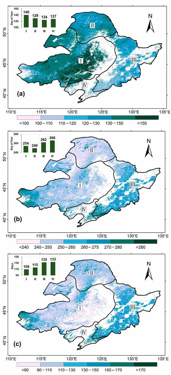 The spatial distribution of phenology indicators since 2001–2021 (a) average SOS, (b) average EOS, and (c) average LOS. Note: four ecoregions: I—temperate grasslands, II—cold–temperate deciduous–coniferous forests, III—temperate coniferous–broad-leaved mixed forests, and IV—warm–temperate deciduous broad-leaved forests.