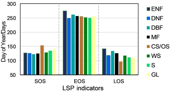 Figure 7 illustrates phenological differences across vegetation types. Forests (ENFs, DNFs, DBFs, and MFs) show the earliest SOS (~125th day) and latest EOS (~260th day), resulting in the longest LOS (~130 days) compared to other vegetation types (i.e., shrublands, savannas, and grassland), except DNFs. DNFs exhibit a slightly earlier EOS (~250th day), leading to a relatively shorter LOS (~120 days). Shrubs (CS and OS) display the latest SOS (~150th day) and the shortest LOS (~96 days). Savannas (S and WS) and grasslands (GLs) have intermediate values, with WS exhibiting slightly earlier SOS (~130th day) and longer LOS (~120 days) than S, likely due to woody cover. Despite similar EOS timing (~250th day) across most vegetation types, the marked variation in SOS primarily determines the difference in LOS.