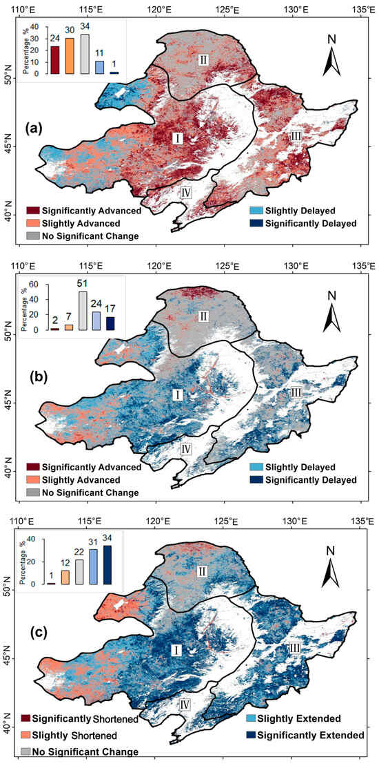 Combining the results of Sen’s slope and M-K significance tests, as shown in Figure 8a, we found that for SOS, more than half of the region of NEC exhibited an advancing trend (54%), with 24% showing significant advancement, 34% showing no significant change, and only 12% of the area showing a delaying trend, mainly located in the northwest of the temperate grasslands (ecoregion I). Regarding the EOS shown in Figure 8b, over half of the area showed no significant change (51%), with 41% of the area exhibiting delays and 9% of the area exhibiting advances. The advanced area was mainly distributed in the northern parts of the cold–temperate deciduous–coniferous forests (ecoregion II), while other parts of this ecoregion mostly showed no significant change. As shown in Figure 8c, due to the advance and delay characteristics exhibited by SOS and EOS, respectively, most areas showed an extended trend (65%) for LOS (with 34% and 31% showing significant and slightly extending, respectively) and only 13% showed a shortening trend (with about 1% of the area having significant shortened LOS), mainly located in the northern regions of ecoregions I and II. The characteristics observed in different ecoregions may be related to their complex vegetation types and geographical locations.