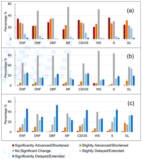 The overall trend of the three phenological indicators for different natural vegetation types is very similar (Figure 9a–c). Notably, SOS shows a significant advancing trend, with the highest proportion of advancing SOS found in savannas (63%) and ENFs (62%), with the significant advancement accounting for 36% and 35%, respectively. The largest proportion of delayed SOS is observed in GLs (20%), while the largest proportion of phenologically stable area is observed in MFs (55% of the area shows no significant change). Most vegetation types show no significant change in EOS (especially Savannas), with the unchanged areas exceeding 40% (except for GLs). The primary trend for the length of season (LOS) is an extension, with the largest percentage of extended pixels observed in DBFs (83%), followed by S and ENFs (both at 73%). DBFs have the lowest percentage of shortened LOS, at a mere 2%, whereas GLs have the highest percentage, at 19%.
