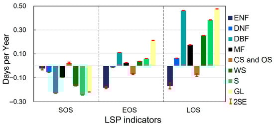 Sen’s results across different natural vegetation types for SOS, EOS, and LOS. Note: ENFs—evergreen needleleaf forests, DNFs—deciduous needleleaf forests, DBFs—deciduous broadleaf forests, MFs—mixed forests, CS—closed shrublands, OS—open shrublands, WS—woody savannas, S—savannas, GLs—grasslands; SE—standard error.