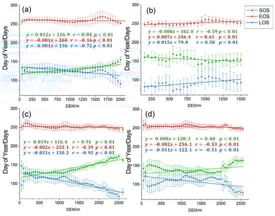 Since the distribution of precipitation and temperature is closely related to elevation, investigating how LSP changes with elevation can help understand the response of LSP to climate factors [53,54,55]. Since the elevation of different vegetation types in the NEC varies, this study analyzed the gradient relationship between LSP and elevation for forests (including ENFs, DNFs, DBFs, and MFs), shrublands (including CS and OS), savannas (including S and WS), and grasslands separately. Elevation was categorized into 50 m intervals and shown with the mean and standard deviation for each class. According to Figure 11a,c,d, as the elevation increases 100 m, the SOS of forests, savannas, and grasslands delay by 1.2, 1.9, and 0.8 days (r = 0.84, 0.91, 0.40), respectively; the EOS of forests, savannas, and grasslands advance by 0.1, 0.2, and 0.2 days (r = −0.16, −0.39, −0.53), respectively; and the LOS of forests, savannas, and grasslands shortens by 0.1, 2.1, and 1.1 days (r = −0.72, −0.92, −0.51), respectively. On the other hand, the shrublands has the opposite trend (Figure 11b): as the elevation increases 100 m, the SOS advances by 0.8 days (r = −0.59), the EOS delays by 0.7 days (r = 0.61), and the LOS extends by 1.5 days, respectively (r = 0.58).