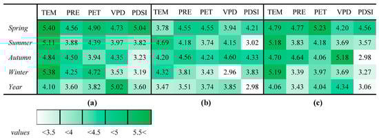 The importance scores of (a) SOS, (b) EOS, and (c) LOS to climate variables (TEM, PRE, PET, VPD, and PDSI) for different seasons. Note: TEM—temperature, PRE—precipitation, PET—potential evapotranspiration, VPD—vapor pressure deficit, and PDSI—Palmer drought severity index.