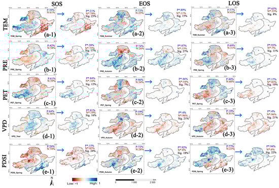 Unlike SOS and EOS, the correlations between LOS and TEM (Figure 13(a-3)) or PRE (Figure 13(b-3)) are not the most prominent, but their positive correlations with LOS can still be observed. PDSI (Figure 13(e-3)) and VPD (Figure 13(d-3)) have the largest significantly correlated areas with LOS, at 22% and 21%, respectively. VPD is mainly negatively correlated with LOS (81% negatively correlated and 96% significantly negatively correlated), mainly distributed in the central and eastern parts of the NEC. PDSI is mainly positively correlated with LOS (77% positively correlated and 94% significantly positively correlated), showing a distinct north–south distribution pattern, with positive correlations mainly in the north and negative correlations mainly in the south. The geographical distribution of the correlation between PET and LOS (Figure 13(c-3)) is opposite to that between PET and SOS (Figure 13(c-1)).