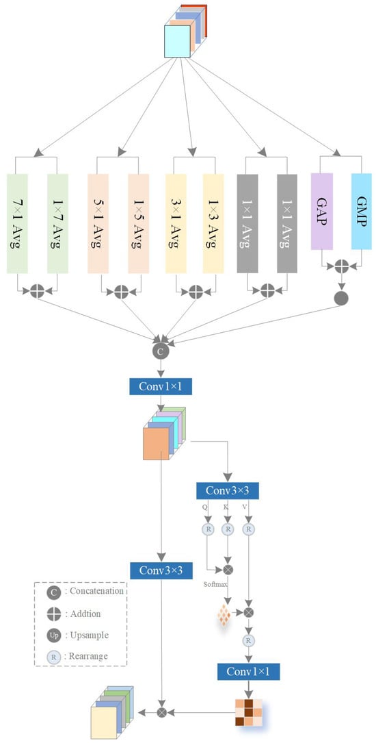 In addition to these, we employ a group of global average pooling (GAP) and global max pooling (GMP) to extract global features. After obtaining multiple sets of feature maps through pooling operations, they are concatenated and then passed through a 1 × 1 convolution layer to adjust the number of channels, which is subsequently divided into two branches. One branch serves as the self-attention branch aimed at fully exploring global contextual information, while the other branch undergoes a 3 × 3 convolution to enhance local feature information.