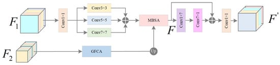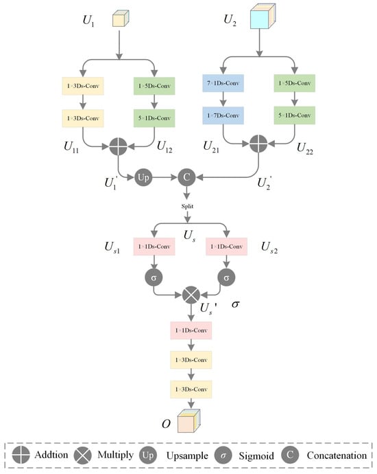 As shown in Figure 6, the inputs to the module are two feature maps at different scales, and . For the branch, after upsampling, the feature map is split into two sub-branches for convolution operations. One sub-branch consists of stripe convolutions with kernel sizes and , while the other sub-branch consists of stripe convolutions with kernel sizes and . The results from these two sub-branches are then added element-wise.