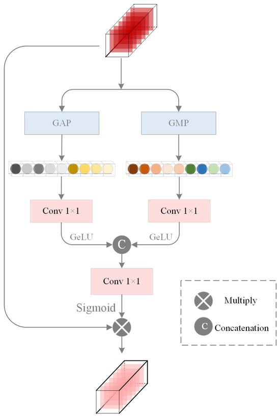 Inspired by channel attention mechanisms such as SENet, FCANet [29], and ECANet [30], we designed the GFCA within the BFMA module, as shown in Figure 4. To preserve edge features and avoid the loss of boundary features caused by direct global pooling, the GFCA module is structured with two branches. These branches respectively use global average pooling and global max pooling to extract global features from the feature maps, enabling the capture of richer global information.