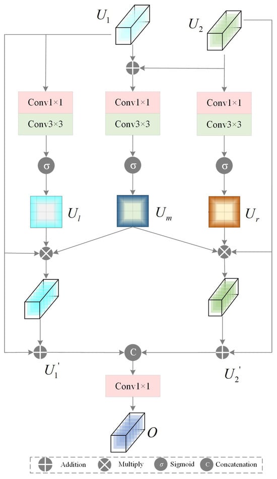 Among them, represents high-level features, represents low-level features, denotes depthwise separable convolution operations, and the subscripts indicate the size of the convolution kernels. denotes upsampling operations, represents the sigmoid activation function, and is the element-wise product result after the convolution operations of branches and .