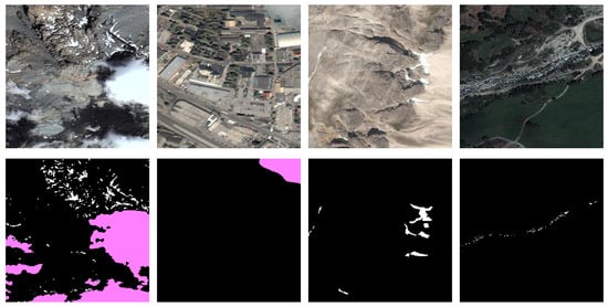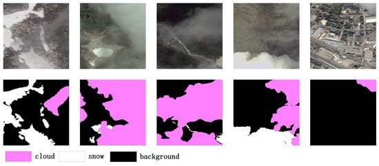 The HRC_WHU dataset has made great contributions to cloud detection research and the academic community, serving as a high-resolution public cloud detection dataset that meets the training and testing needs of deep learning models. It includes 150 high-resolution images with RGB channels, featuring resolutions ranging from 0.5 to 15 m, covering different regions globally. These images are sourced from Google Earth, integrating satellite imagery, aerial photography, and Geographic Information System (GIS) data. The associated reference cloud masks were digitized by experts in remote sensing image interpretation at Wuhan University. Using the HRC_WHU dataset could facilitate performance benchmarking for deep learning models in image classification tasks. In Figure 8, we display some images from the dataset. The first row shows the original color images, while the second row presents the corresponding classification label maps for the remote sensing images. In these label maps, white areas represent snow cover, and black areas denote the background, as shown in Figure 8.