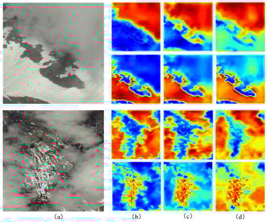 Heatmaps of cloud and snow under different module combinations. (a) Test image; (b) MPFP + BFMA + MFCF; (c) MPFP + BFMA; (d) MPFP.