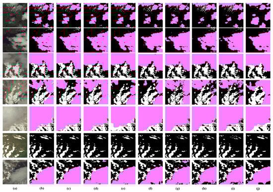 Visualization of segmentation performance on the CSWV dataset. (a) Test image; (b) Ground truth; (c) MFMANet; (d) U-Net; (e) CSDNet; (f) DFNNet; (g) PAN; (h) PSPNet; (i) ACFNet; (j) DeepLabV3+. In this figure, pink represents cloud, black represents background, and white represents snow.