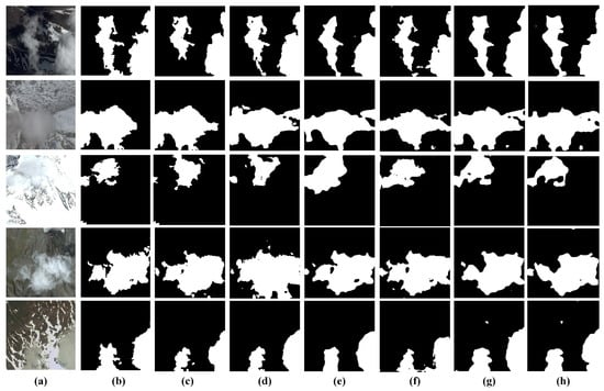 Comparison of segmentation results on the HRC_WHU dataset. (a) Test image; (b) Ground truth; (c) MFMANet; (d) OCRNet; (e) ACFNet; (f) PSPNet; (g) DeepLabV3+; (h) DFN. In this figure, black represents background, and white represents cloud.