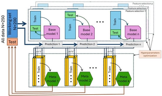 Schematization of data flow. The working set, composed of 80% of the data, was used for base models training and testing with a secondary 80:20 random split. Base models’ predictions on the working set were used for meta-model training.