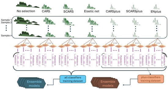 For selecting the most important features, we evaluated three different techniques: the competitive adaptive reweighted sampling (CARS), its stability version (SCARS), and the Elastic Net (EN). In addition, we adopted a further selection method for each one of them (secondary selection) to reduce the number to around 20 features only (CARSplus, SCARSplus, and ENplus, respectively). All methods were also compared with a no-feature selection dataset (FULL).