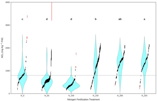All samples nitrate (NO3) content on a fresh weight (FW) basis data (mg kg−1, vertical axis), reconstructed as confidence intervals (vertical segments), are distinguished into 3 categories: outliers, undecidable, and allowed for further analysis (red, grey, and black, respectively). Letters referring to Tuckey’s HSD post hoc test output and violin plots (cyan shapes) are performed across the varying nitrogen fertilization treatments (horizontal axis), considering only allowed samples. The horizontal grey dashed line represents the threshold to determine the sample’s actual classes (positive above).