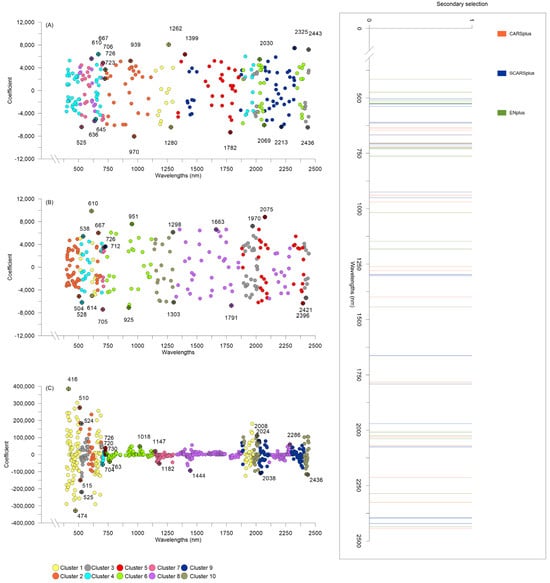 Features selected by (A) CARS, (B) SCARS, and (C) Elastic Net, EN techniques are represented by colored dots with the horizontal axis following wavelength (nm) and the vertical axis the recorded b coefficient. Features selected by secondary selection methods CARSplus, SCARSplus, and ENplus (in (A), (B), and (C), respectively) are identified/highlighted by the ⛒ symbol and labeled with the corresponding wavelength. Colors represent the clusters identified during the secondary selection procedures. In the box, the distribution of the combined secondary selection features across the entire recorded spectrum for CARSplus, SCARSplus, and ENplus (labeled/identified with different colors).