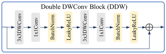 The decoder mirrors the encoder’s multi-scale structure in reverse, progressively restoring spatial resolution while reusing encoded features to refine predictions. Three decoder stages are employed, each consisting of a 2× upsampling operation, a channel-wise connection from the corresponding encoder layer, and a double-layer depth-wise separable convolution (DDW) block for feature reconstruction. The calculation of DDW is shown in Figure 3.
