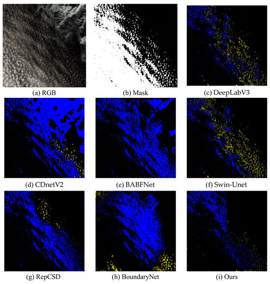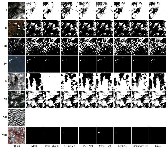 To evaluate CDWMamba’s performance, six state-of-the-art cloud detection models were employed in the experiment. DeepLabV3+ [32] is an encoder–decoder architecture that incorporates atrous spatial pyramid pooling for capturing multi-scale contextual information. CDnetV2 [33] is a CNN-based model that integrates both channel and spatial attention mechanisms to enhance feature representation. BABFNet [34] is an encoder–decoder cloud detection model that introduces an edge prediction branch to improve cloud boundary localization. Swin-Unet [20] is a hybrid segmentation model combining Transformer-based Swin blocks with a U-Net architecture. RepCSD [35] employs a reconfigurable multi-scale feature fusion module to capture cloud features at different spatial resolutions. BoundaryNet [34] proposes a scalable boundary-aware network to adaptively detect clouds of varying sizes.