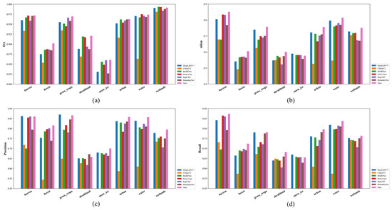Evaluation results across different land cover types. (a–d) demonstrate OA, mIoU, precision, and recall, respectively.