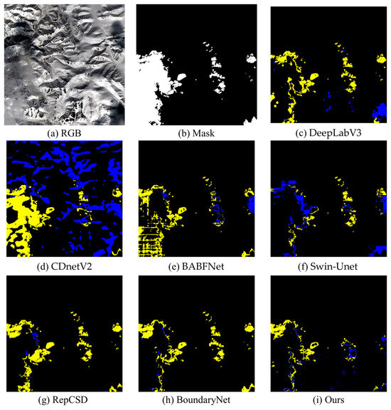 In the Landsat-8 example as shown in Figure 7, the cloud formations are highly fragmented and spectrally similar to the underlying snow cover. All methods exhibit significant false positive regions (blue areas), indicating the difficulty of distinguishing fine cloud patterns from snow surfaces using spectral features alone. However, our CDWMamba method shows a noticeable reduction in yellow regions, meaning it misses fewer cloud pixels and cloud shadows. This suggests that the model has a stronger recall ability, particularly in resolving small, subtle cloud structures amid high-reflectance backgrounds.