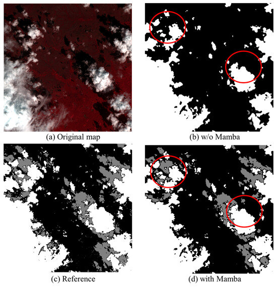 To further illustrate the effectiveness of the proposed Mamba module, we present a set of comparative visual results in Figure 9. Specifically, Figure 9b,d show the cloud detection outputs with and without the Mamba module, respectively. The red circles highlight regions where notable differences are observed between the two versions. It is evident that the results without the Mamba module suffer from significant omissions, particularly in regions with fragmented or subtle cloud structures. In contrast, the inclusion of the Mamba module leads to more complete and accurate cloud delineation. This comparison illustrates that the global contextual interaction capability of the Mamba module plays a crucial role in capturing long-range dependencies and improving cloud detection performance across complex scenes.