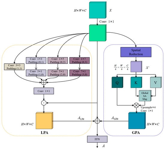Based on the aforementioned challenges in capturing global context dependences and supplementing local information for the Transformer-based SA mechanism, we propose the Dual-Path Attention (DPA) mechanism, building upon the PVT. The key innovation of DPA is to reduce the resolution of feature maps after the SR operation, thereby further decreasing the sequence length and enabling the extraction of coarse global context dependencies at a lower computational cost. To address the potential loss of local details, we incorporate attention-based convolution to refine the feature representation. As illustrated in Figure 2, DPA consists of two parallel branches: Global Path Attention (GPA) and Local Path Attention (LPA). In the GPA branch, the input feature map undergoes SR followed by four applications of 4×4 convolution downsampling, which reduces the computational complexity and establishes coarse-grained global context dependencies. In the LPA branch, multi-scale local features are extracted through a combination of 3 × 3 standard convolution and strip convolutions (including 1 × 3, 3 × 1, 1 × 5, 5 × 1, 1 × 7, and 7 × 1 kernels). These features are then fused, added together, and dot-multiplied with the original input to capture fine local spatial details and complement the global context captured by GPA. Strip convolution is employed for two reasons. First, it is computationally efficient, as it mimics the effect of a 7 × 7 convolution kernel using pairs of 7 × 1 and 1 × 7 kernels, significantly reducing the computational overhead compared to standard 2D convolutions. Second, in the context of building segmentation in remote sensing images, many buildings exhibit elongated, strip-like shapes, making strip convolution particularly effective in capturing such features. Finally, the global and local feature representations obtained from GPA and LPA are concatenated and fed into a feedforward neural network (FFN) for further feature fusion and refinement. The overall calculation process of DPA can be expressed as follows: