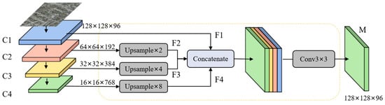 where Upsample( ) represents the upsampling operation, and Conv3×3( ), BN( ), and ReLU( ) represent 3 × 3 convolution, batch normalization, and ReLU activation functions, respectively. Then, the smooth feature is concatenated, the dimension of the concatenated feature map is reduced, and the feature map after multi-scale feature fusion is output as follows: