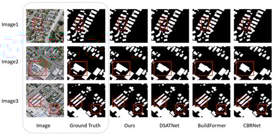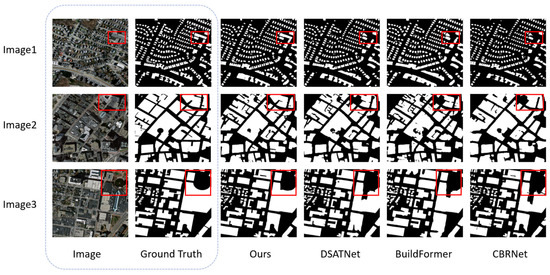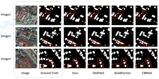 To validate the effectiveness of the proposed method and further verify our conclusions, we conducted visual comparisons by randomly selecting three images from the test set of each dataset: Massachusetts, WHU, and Inria. These images were segmented using the proposed method and several representative mainstream state-of-the-art methods, including DSATNet, BuildFormer, and CBRNet. We present the visualization results of these three representative methods based on the following considerations. Firstly, these three methods represent the current mainstream processing paradigms (CNN-based methods and the hybrid structure based on CNN–Transformer), and their visual comparisons have been able to clearly show the essential differences in the performance of building segmentation in remote sensing images among different methods. Secondly, the detailed quantitative metrics provided in Table 1 cover all of the comparison methods and form a complete chain of evidence with the visualization results. Finally, to avoid the core conclusion being dispersed due to too many visual images, we adopt the same presentation strategy of “representative methods + comprehensive data” as in most of the literature. For the results shown in Figure 5, Figure 6 and Figure 7 (corresponding to the Massachusetts, WHU, and Inria datasets, respectively).