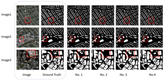 To verify the effectiveness of the proposed modules, we conducted ablation experiments on the Massachusetts dataset and analyzed the results. We chose the Massachusetts Building dataset for the ablation experiment because it contains most of the common complex scenes in the building segmentation of remote sensing images and is one of the most representative datasets for building segmentation in remote sensing images. Compared with the WHU Building dataset and the Inria Aerial Image Labeling dataset, the Massachusetts Building dataset is more challenging and can better validate the effectiveness of the modules. The results of the ablation of various modules are shown in Table 3. “No. 1” signifies the experimental result corresponding to the combination of the FPE module and the DPA mechanism (exclusion of solely the MFF module). “No. 2” denotes the experimental result related to the combination of the MFF module and the DPA mechanism (exclusion of solely the FPE module). “No. 3” represents the experimental result for the combination of the MFF module and the FPE module (omission of solely the DPA mechanism). “No. 4” reflects the experimental result pertaining to the complete MFFP-Net methodology proposed in this study.