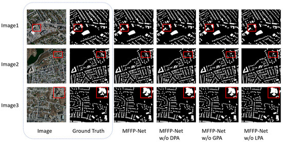 To more intuitively verify the effectiveness of the modules proposed in this paper, we randomly selected three images from the test set of the Massachusetts dataset for visual analysis, as illustrated in Figure 8. Image3 in Figure 8 clearly shows that, after removing FPE, the buildings in the central region of the red box exhibit significant foreground error segmentation into the background, primarily due to substantial intra-class variance. As shown in Image1, the elimination of MFF results in the failure to accurately identify the small buildings located between the two rows of larger structures within the red box, caused by insufficient feature information. Furthermore, Image2 demonstrates that removing FPE leads to erroneous segmentation in the central region of the red box, incorrectly classifying foreground elements as background. Image3 also reveals that removing DPA causes the building in the upper-left corner of the red box to be misclassified as foreground, as the convolutional network fails to adequately model the global contextual information. These segmentation outcomes strongly demonstrate the efficacy and superiority of each module proposed in this paper. Specifically, MFF, which integrates shallow features across different levels, allows the network to focus more on shallow features that are rich in small target information, thereby improving the ability to extract small target buildings. FPE effectively mitigates the adverse effects of significant intra-class variance on model performance by strengthening the correlation among foreground classes and reducing false positives. DPA, on the other hand, enables the simultaneous acquisition of local information and establishment of global contextual dependencies, providing the model with more effective feature information for the target being segmented. Collectively, these three components work synergistically to enhance the model’s segmentation performance.