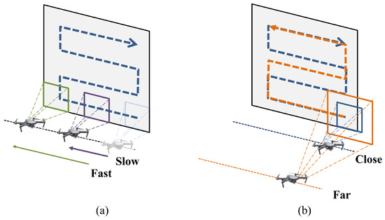 While UAV flight methods are closely related to the selection of camera settings, previous studies have largely overlooked the importance of their relationship. UAV flight methods are often derived based on the UAV’s mission planning tools. However, these derived flight methods may be infeasible according to the field or survey conditions. For instance, in underground tunnel construction, only 3–10 min are typically allocated for rock face surveys. Surveys generally require a specific target resolution or ground sampling distance (GSD), which subsequently limits the permissible height or distance from the target [26]. For urban mapping and forestry applications, altitudes between 100 and 120 m provide a good balance between resolution and coverage [27,28]. Nevertheless, such limitations restrict the range of feasible UAV flight paths, which in turn affects image quality.