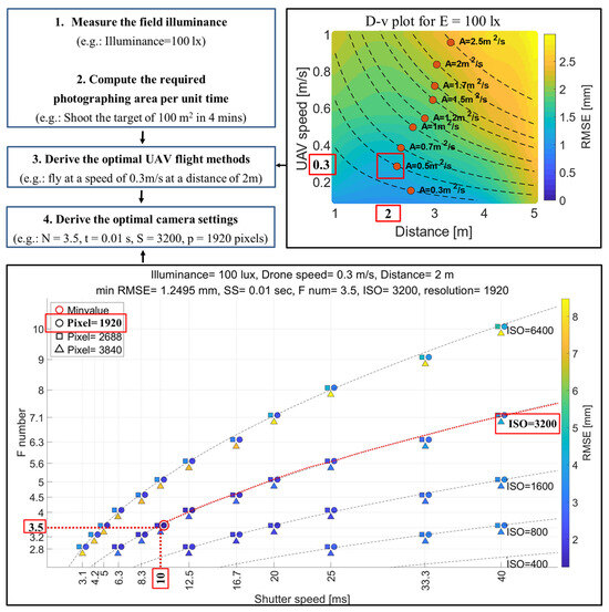 A point of potential confusion is that the D–v chart, utilized in Step 3, is derived from analyzing the minimum camera setting values under various E–D–v conditions, as detailed in Step 4. Nevertheless, determining the optimal UAV flight methods must precede the selection of optimal camera settings, as the latter is influenced by the former. It is important to note that the optimal UAV flight methods identified in Step 3 are only effective when combined with the optimal camera settings identified in Step 4. This dependency highlights the intricate relationship between UAV flight methods and camera settings in minimizing error.