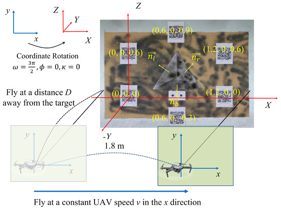 Flow chart for deriving the OPS for UAV-based SfM–MVS. Experimental setup and axis settings. The normal vector for the left plane is represented as nl = (0.423, 0.876, −0.217), for the right plane as nr = (0.438, 0.869, −0.229), and for the bottom plane as nb = (−0.001, 0.857, 0.516). ω, ϕ, and κ represent the rotation angles around the x-, y-, and z-axes, respectively, between the 2D camera coordinate system and the 3D object coordinate system.