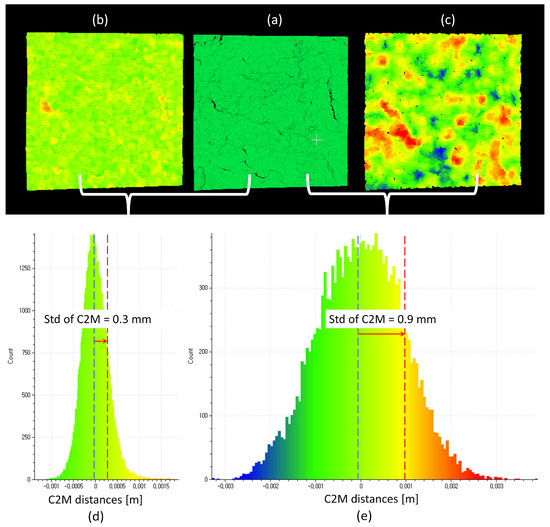 Example of calculating the stdC2M distances. Colors represent the C2M distances to the reference model. The same procedure was conducted for calculating the stdM3C2 distances: (a) Reference model of joint plane #2; (b) point cloud generated using SfM–MVS with settings #3; (c) point cloud generated using SfM–MVS with settings #4; (d) histogram of C2M distances for settings #3, with a resulting stdC2M of 0.3 mm; (e) histogram of C2M distances for settings #4, with a resulting stdC2M of 0.9 mm.