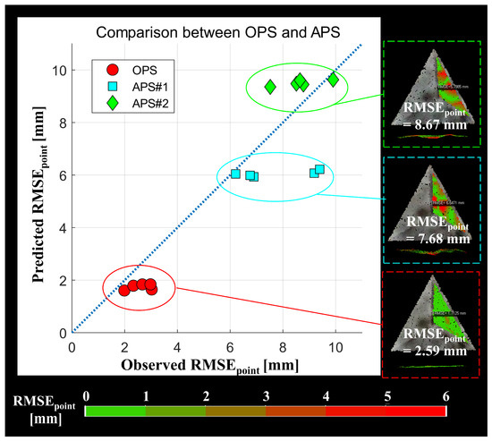 Figure 9 illustrates the point cloud error levels for the reference. A significant difference in error levels was observed between the OPS and APS. The mean error level for the OPS (red dots in Figure 9) was 2.59 mm, while the APS results showed notably higher errors: 7.58 mm for APS#1 (cyan squares in Figure 9) and 8.67 mm for APS#2 (green diamonds in Figure 9). The improvement in error levels when using the OPS was expected, as it represents the minimum error achievable with photography settings derived from the error pre-determination model developed by Leem et al. [30], which has demonstrated high predictive performance (note the alignment between the predicted and observed RMSEs in Figure 9). Furthermore, severe distortion in the representation of flat planes was observed in the APS-generated point clouds, as shown in the side views of Figure 9. Notably, without modifying the existing illuminance and time constraints, substantially better point cloud quality could be achieved simply by adjusting the camera settings and UAV flight methods.