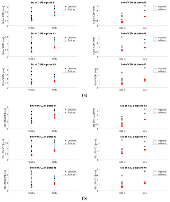 The stdC2M and stdM3C2 values of the OPS and APS are listed in Table 6 and Table 7, respectively, with their comparison illustrated in Figure 10. In the figure, red dots represent the std values for the OPS, while black dots indicate the std values for the APS. It is evident that the red dots consistently lie below the black dots under both 50 and 1500 lx conditions. With the exception of two cases for stdC2M (joint planes #4 and #5, E = 1500 lx), where the APS achieved the second lowest stdC2M, the lowest and second lowest stdC2M and stdM3C2 values were obtained using the OPS in all other cases. This result suggests that the OPS can generate 3D models that more closely resemble the reference than those created using the APS, thereby indicating that the OPS produced more accurate 3D models.