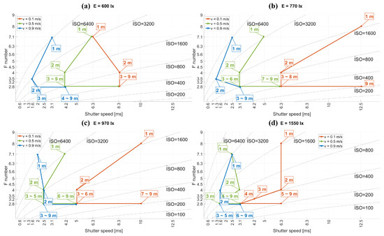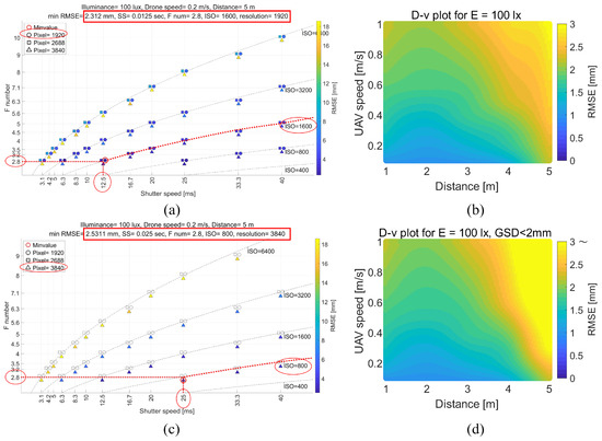 The relationship between the optimal (D, v) and A is complex, as it is affected by variations in camera settings at each (D, v) point. In Figure 3b, the most favorable D–v condition for A = 0.5 m2/s, D = 2 m, and v = 0.3 m/s leads to a minimum error of 1.25 mm with camera settings of t = 1/100 s, N = 3.5, S = 3200, and p = 1920 px. In contrast, for A = 1.5 m2/s with D = 3 m and v = 0.7 m/s, the minimum error is 1.97 mm using camera settings of t = 1/160 s, N = 2.8, S = 3200, and p = 1920 px. Furthermore, the optimal (D, v) also varies depending on illuminance levels. For example, at E = 100 lx, the optimal UAV flight method for A = 0.5 m2/s is D = 2 m and v = 0.3 m/s (as shown in Figure 3b), whereas at E = 250 lx, it shifts to D = 3 m and v = 0.2 m/s for the same A (as shown in Figure 3d).