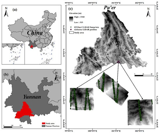Overview of the study area: (a) location within China, (b) position within Yunnan Province, (c) ICESat-2 laser footprints and airborne LiDAR data coverage in the Pu’er study area. In panel (c), green points represent ICESat-2 laser footprints (signal photons after filtering), red points represent airborne LiDAR sampling point locations, and the grayscale background displays the digital elevation model (DEM) generated from airborne LiDAR data.