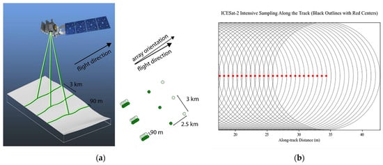 Geometric layout of ICESat-2 ATLAS instrument ground footprints and along-track sampling schematic. (a) Schematic diagram of ICESat-2 multi-beam laser altimetry principle (https://nsidc.org/data/ATL03, accessed on 27 January 2025). (b) Schematic of ICESat-2 along-track footprints and center point distribution.