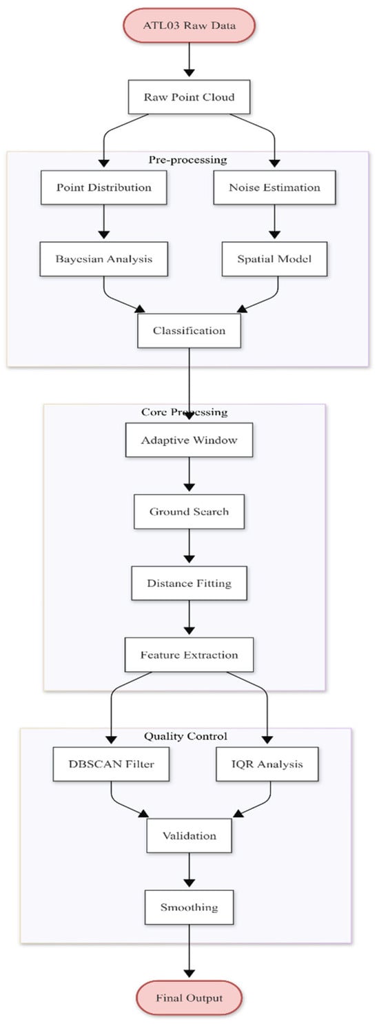 Subsequent to photon classification, identified signal photons were utilized for the derivation of canopy height. The accurate determination of canopy height is contingent upon the effective alignment of sampling window dimensions with the local canopy scale [,]. To overcome the limitations associated with conventional fixed-window approaches, this study implemented an adaptive search strategy for the optimal selection of terrain reference points. This strategy dynamically optimizes the search for ground returns corresponding to each canopy photon, rather than relying on fixed-length segmentation. Specifically, for each potential canopy photon, the algorithm initiated a search for terrain reference points within an initial radius of 50 m, progressively expanding this radius up to a maximum of 200 m, until a minimum of three suitable terrain points (nearby_ground ≥ 3) were identified. To refine the accuracy of the local terrain elevation estimate, a distance-weighting scheme was applied to these identified terrain reference points, assigning greater influence to closer points. Further quality control measures were instituted: (i) a minimum of three valid terrain reference points were required for the estimation of terrain elevation beneath each canopy photon; (ii) a standard DBSCAN algorithm (ε = 5 m, MinPts = 2) was subsequently used to filter out anomalous terrain points from the selected local set; and (iii) the interquartile range (IQR) method (1.5 × IQR criterion) was applied to detect and remove outlier canopy height values. For computational efficiency, the final terrain elevation at each point was calculated using a distance-weighted averaging approach within an enlarged smoothing window to mitigate residual noise effects. A detailed flowchart illustrating the complete ATL03 data processing workflow is presented in Figure 3.