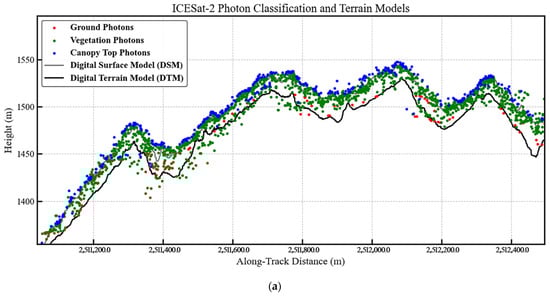 The precise classification of photon data is a fundamental prerequisite for the accurate derivation of understory terrain and canopy height metrics from ICESat-2/ATLAS data, as it directly influences the fidelity of subsequent retrievals. In complex forested terrains, both photon penetration through the canopy and the subsequent classification of returns present considerable challenges. As illustrated in Figure 4a, a significant portion of emitted photons are scattered at the canopy top or within the canopy volume. This scattering results in a sparser distribution of photons reaching the ground, which complicates understory terrain measurement [] and reflects the substantial interference imposed by complex forest structures on laser photon penetration. Notwithstanding these difficulties, the employed BDT-ADBSCAN algorithm demonstrated effective identification of ground photons, yielding a terrain profile generally consistent with that derived from the LiCHy DEM. This consistency substantiates the potential of ICESat-2 for ground detection even under such challenging terrain conditions.