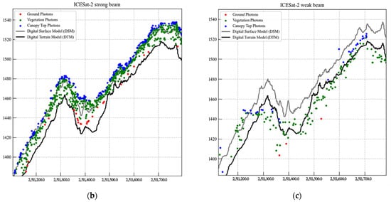 Further examination of Figure 4c reveals instances where multiple classified photon types (including those identified as ground photons (red dots) and vegetation photons (green dots)) are located significantly below the reference DTM profile. Such occurrences lead to substantial underestimation of both terrain elevation and, consequently, canopy height. This observation points to considerable classification uncertainty and a degradation in accuracy when processing weak-beam data, particularly under steep terrain conditions. In environments characterized by complex forest architecture and high canopy density, strong-beam data consistently provided a more comprehensive characterization of both forest and underlying terrain structures. Specifically, in regions with tall canopies, strong beams were able to penetrate multiple canopy layers more effectively, thereby acquiring a greater number of ground photons and enhancing the capability for precise retrieval of both forest structural attributes and terrain elevation.