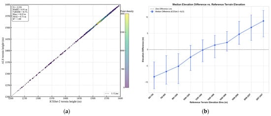 Accuracy assessment of ICESat-2 terrain elevations using airborne LiDAR data: (a) scatterplot of ICESat-2 versus ALS terrain heights, illustrating overall correlation and point density; (b) median elevation differences (ICESat-2—ALS) across ALS terrain elevation bins, with interquartile range (IQR) error bars.