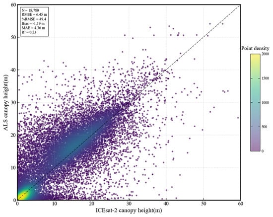 Comparative analysis of ICESat-2 canopy height with airborne laser scanning (ALS) reference data (Figure 6) indicates a moderate correlation between the two (R2 = 0.53). The scatter distribution shows a significant systematic bias, with ICESat-2 measurements generally lower than the reference line, with an overall bias of −1.19 m. Statistical indicators show that this dataset (N = 18,780) has an RMSE of 6.45 m, a relative error of 49.4%, and an MAE of 4.36 m, indicating substantial uncertainty in ICESat-2 canopy height estimation. Particularly in high canopy regions (>30 m), data points exhibit increased dispersion, suggesting that measurement accuracy decreases as canopy height increases.