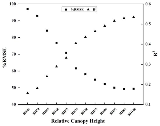 Figure 7 presents the influence of RH on forest canopy height estimation accuracy. Results indicate that %RMSE and R2 exhibit opposite trends with changes in RH values. The %RMSE shows a significant decreasing trend as RH values increase, dropping from 97% at RH48 to 49% at RH100. This decreasing trend is particularly pronounced in the RH48-RH75 range and becomes more gradual after RH75, with %RMSE stabilizing at approximately 50% in the RH90–RH100 range. Conversely, R2 steadily increases with rising RH values, from 0.15 at RH48 to 0.53 at RH100, with an accelerated growth rate particularly in the RH75–RH90 range, after which it plateaus. At RH90, as %RMSE decreases to approximately 50%, R2 reaches 0.51, indicating that this percentile likely represents a critical characteristic of forest canopy structure in the study area. Based on these findings, selecting high-percentile metrics within the RH90–RH100 range has significant implications for improving forest canopy height estimation accuracy.