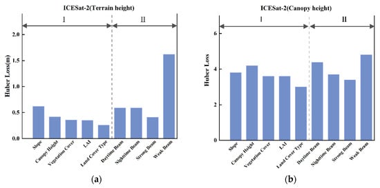 Huber loss-based accuracy assessment of ICESat-2 (a) terrain elevation and (b) canopy height retrievals. Group I includes terrain and environmental variables, with ‘Canopy Height’ derived from the LiCHy CHM. Group II denotes laser beam types.