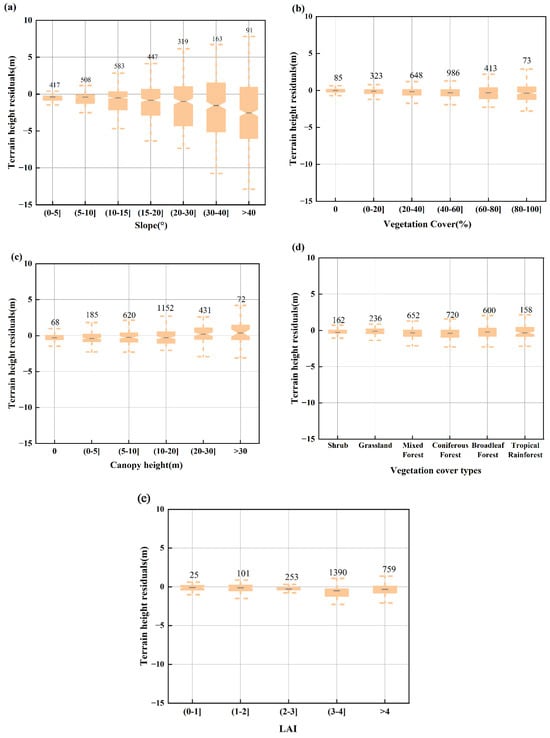 ICESat-2 terrain elevation residuals (relative to LiCHy LiDAR data) with varying environmental factors: (a) slope, (b) vegetation cover percentage, (c) canopy height, (d) vegetation cover type, and (e) LAI.