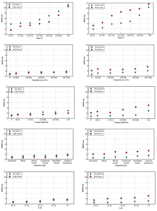 Variations in the RMSE of ICESat-2 terrain height inversion under different environmental factors and beam types.
